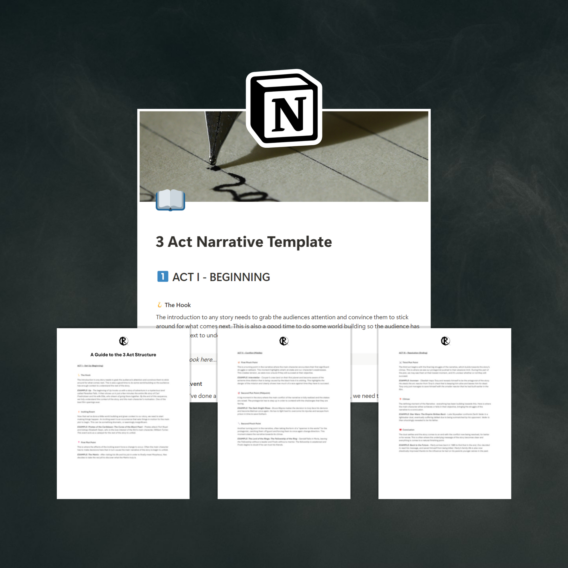 A Notion worksheet designed to help you to write your own story or script using the 3 Act Narrative.